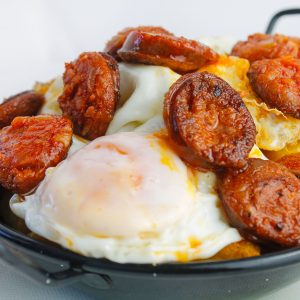 Sartén de huevos fritos con chorizo, jamón o picadillo